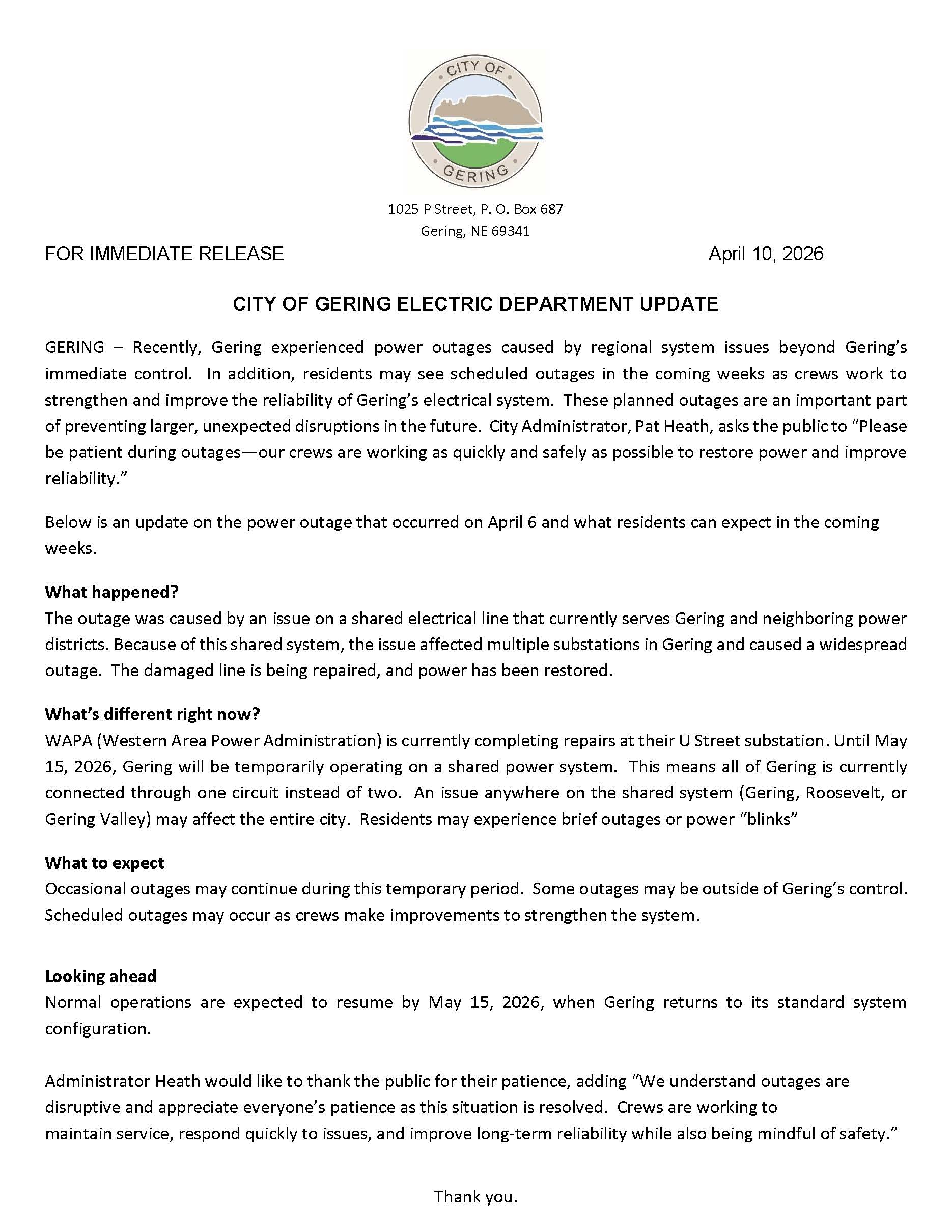 Enter your email to subscribe to the City of Gering community newsletter. Stay up-to-date on all the news, updates, and events happing in your city!