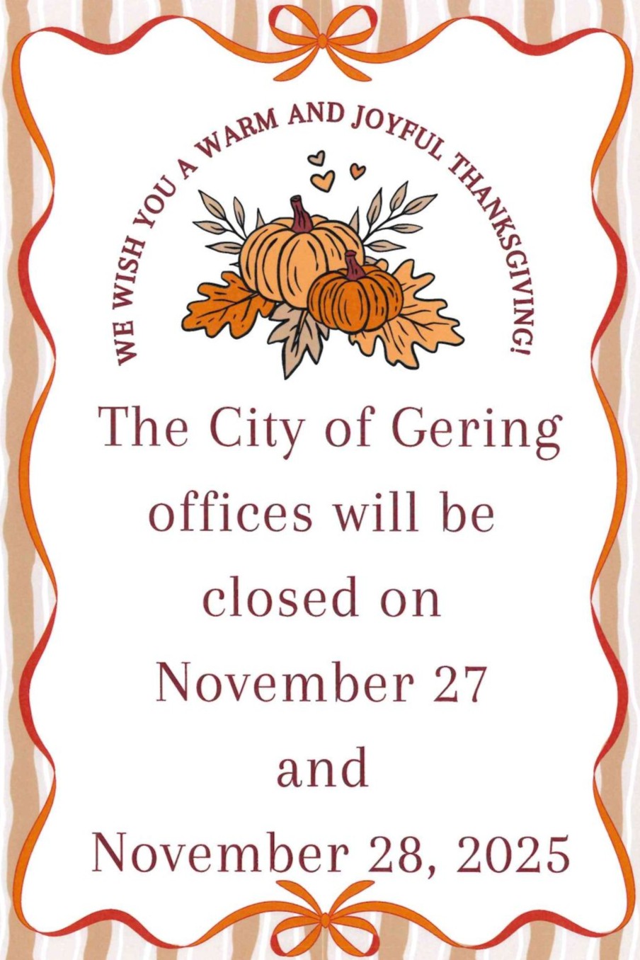 The City of Gering offices will be closed and we wish you a safe and blessed Thanksgiving.